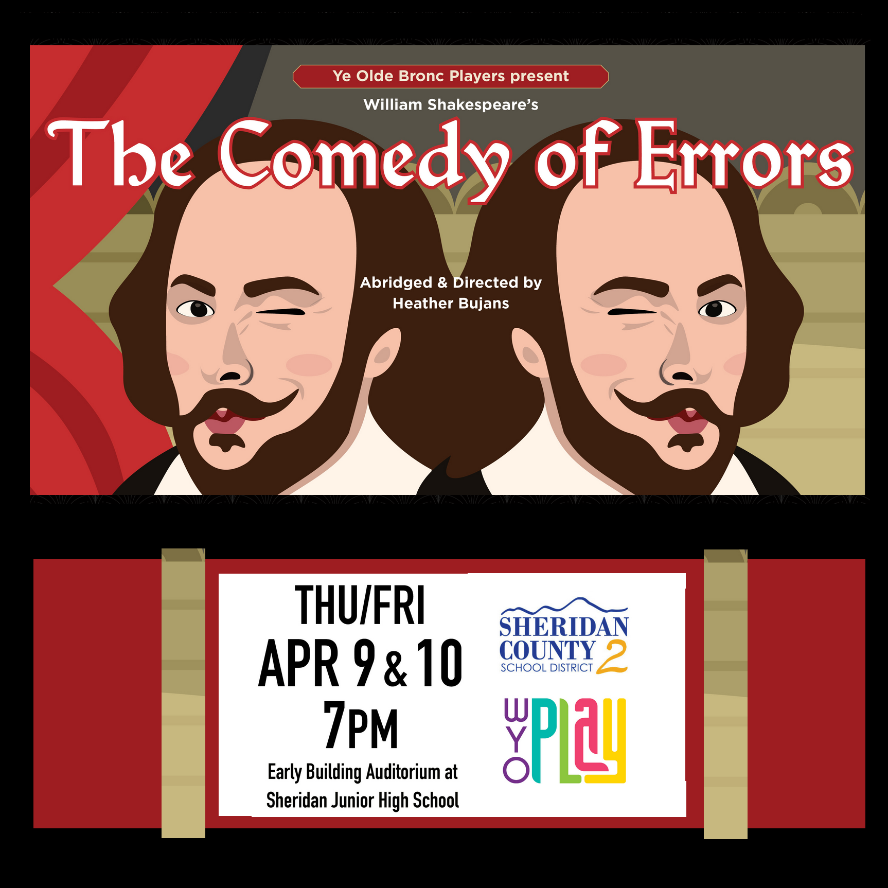 Back to All Events Ye Old Bronc Players present Shakespeare's THE COMEDY OF ERRORS Thursday, April 9, 2026 7:00 PM 8:30 PM Sheridan Junior High School 500 Lewis Street Sheridan, WY, 82801 United States (map) Google Calendar ICS In The Comedy of Errors, Shakespeare turns total chaos into farce as two sets of long-lost twins accidentally swap lives, sparking wild mix-ups, ridiculous accusations, and a hilariously tangled journey on the way to a happy reunion.
